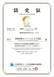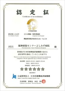 日本医療機能評価機構より、主たる機能種別「慢性期病院」および副機能種別「リハビリテーション病院」について、「認定」の評価を受けることができました。